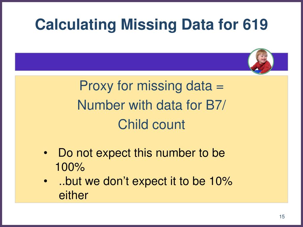 Calculating Missing Data for 619 Proxy for missing data = Number with data for B7/ Child count • Do not expect this number to be 100% • ..but we don’t expect it to be 10% either