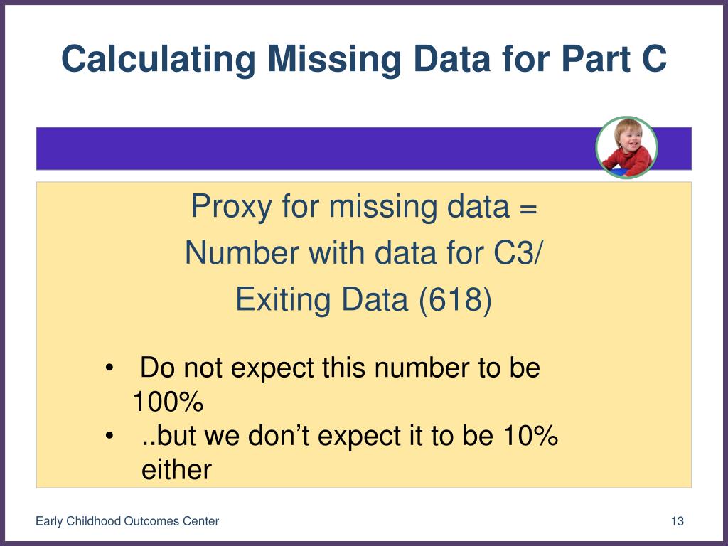 Calculating Missing Data for Part C Proxy for missing data = Number with data for C3/ Exiting Data (618) • Do not expect this number to be 100% • ..but we don’t expect it to be 10% either Early Childhood Outcomes Center
