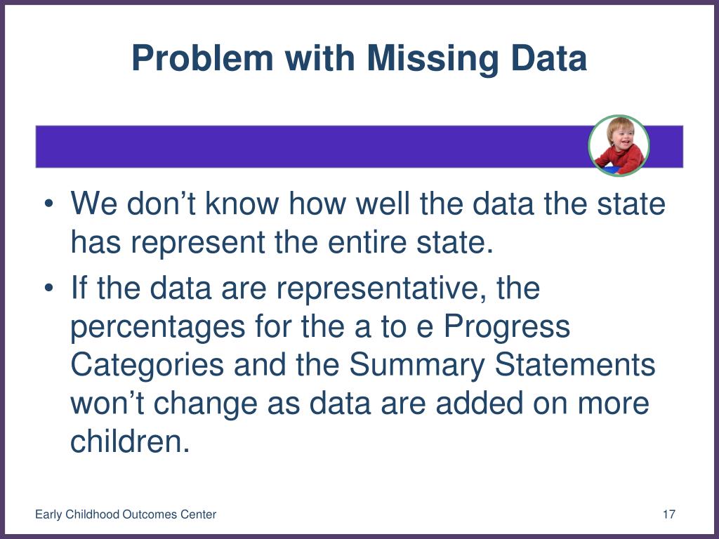 Problem with Missing Data • We don’t know how well the data the state has represent the entire state. • If the data are representative, the percentages for the a to e Progress Categories and the Summary Statements won’t change as data are added on more children. Early Childhood Outcomes Center