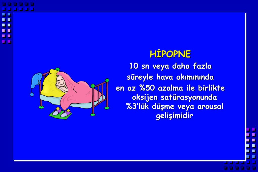 HİPOPNE 10 sn veya daha fazla süreyle hava akımınında en az %50 azalma ile birlikte oksijen satürasyonunda %3’lük düşme veya arousal gelişimidir