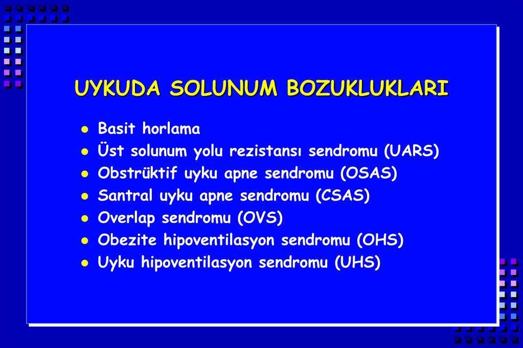 UYKUDA SOLUNUM BOZUKLUKLARI Basit horlama Üst solunum yolu rezistansı sendromu (UARS) Obstrüktif uyku apne sendromu (OSAS) Santral uyku apne sendromu (CSAS) Overlap sendromu (OVS) Obezite hipoventilasyon sendromu (OHS) Uyku hipoventilasyon sendromu (UHS)