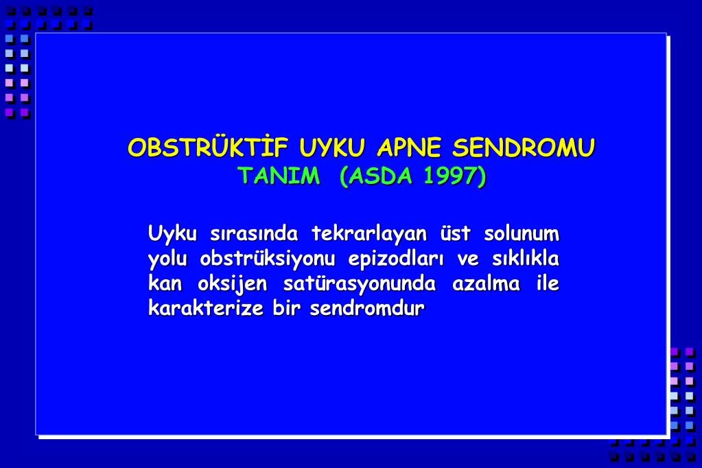 OBSTRÜKTİF UYKU APNE SENDROMU TANIM (ASDA 1997) Uyku sırasında tekrarlayan üst solunum yolu obstrüksiyonu epizodları ve sıklıkla kan oksijen satürasyonunda azalma ile karakterize bir sendromdur