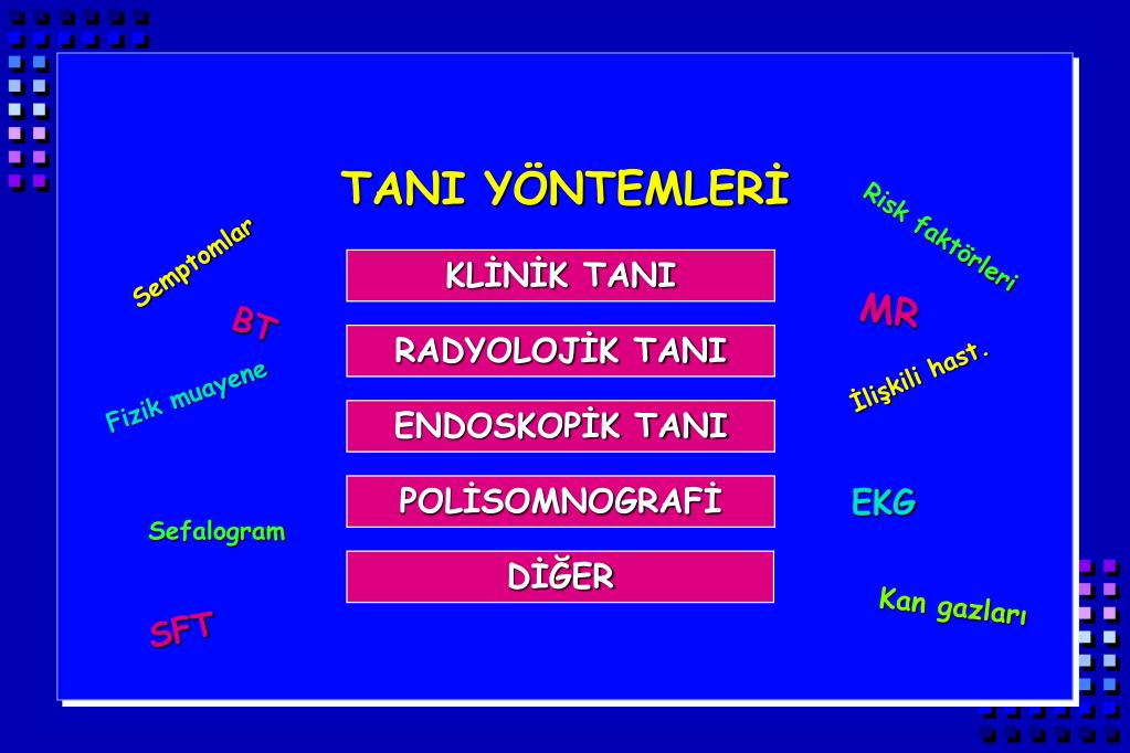 TANI YÖNTEMLERİ Risk faktörleri Semptomlar KLİNİK TANI MR BT RADYOLOJİK TANI İlişkili hast. Fizik muayene ENDOSKOPİK TANI POLİSOMNOGRAFİ EKG Sefalogram DİĞER Kan gazları SFT