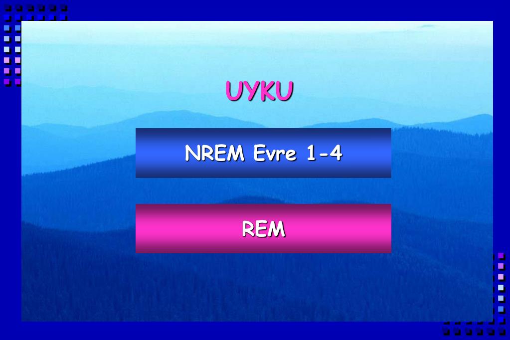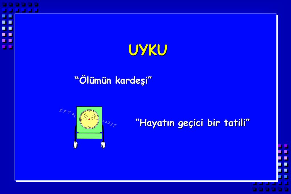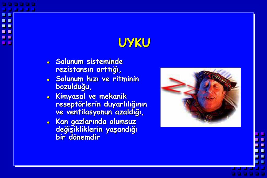 UYKU • Solunum sisteminde rezistansın arttığı, • Solunum hızı ve ritminin bozulduğu, • Kimyasal ve mekanik reseptörlerin duyarlılığının ve ventilasyonun azaldığı, • Kan gazlarında olumsuz değişikliklerin yaşandığı bir dönemdir