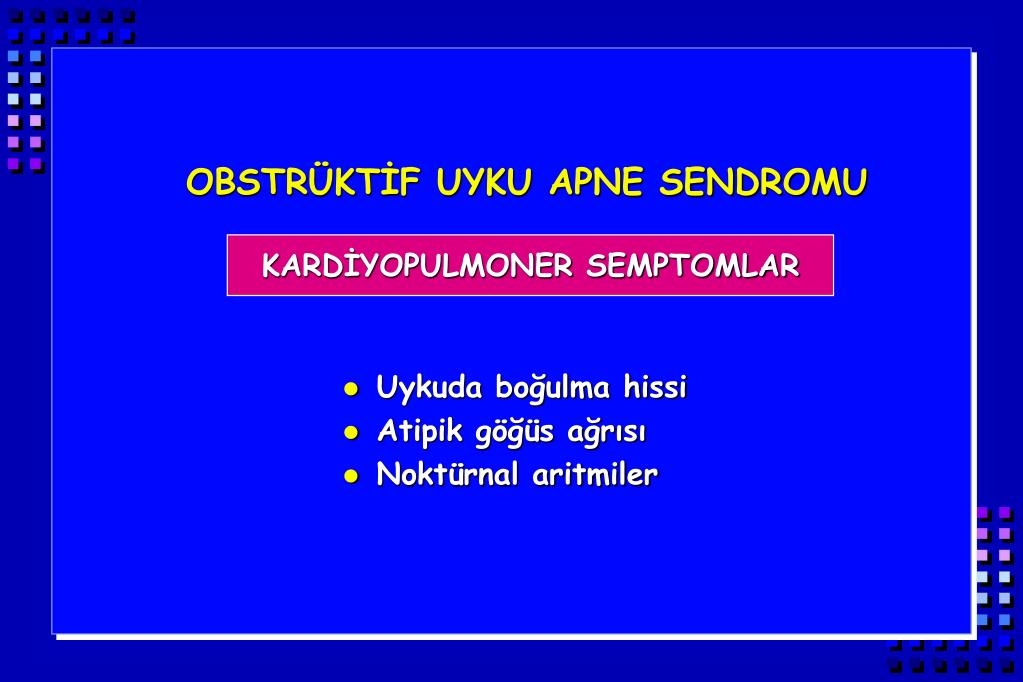 OBSTRÜKTİF UYKU APNE SENDROMU KARDİYOPULMONER SEMPTOMLAR Uykuda boğulma hissi Atipik göğüs ağrısı Noktürnal aritmiler
