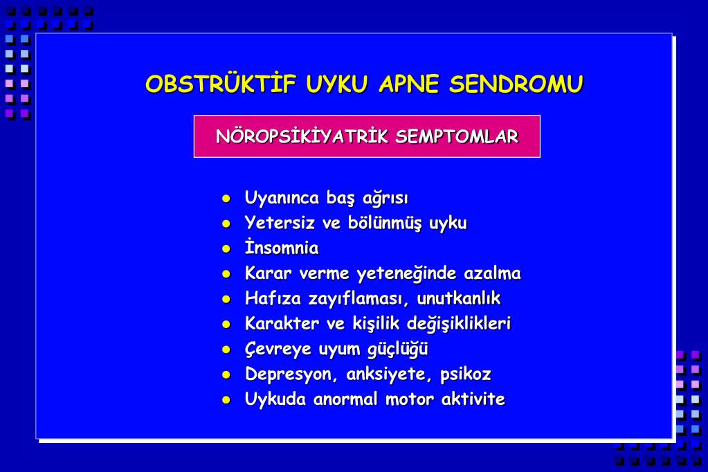OBSTRÜKTİF UYKU APNE SENDROMU NÖROPSİKİYATRİK SEMPTOMLAR Uyanınca baş ağrısı Yetersiz ve bölünmüş uyku İnsomnia Karar verme yeteneğinde azalma Hafıza zayıflaması, unutkanlık Karakter ve kişilik değişiklikleri Çevreye uyum güçlüğü Depresyon, anksiyete, psikoz Uykuda anormal motor aktivite