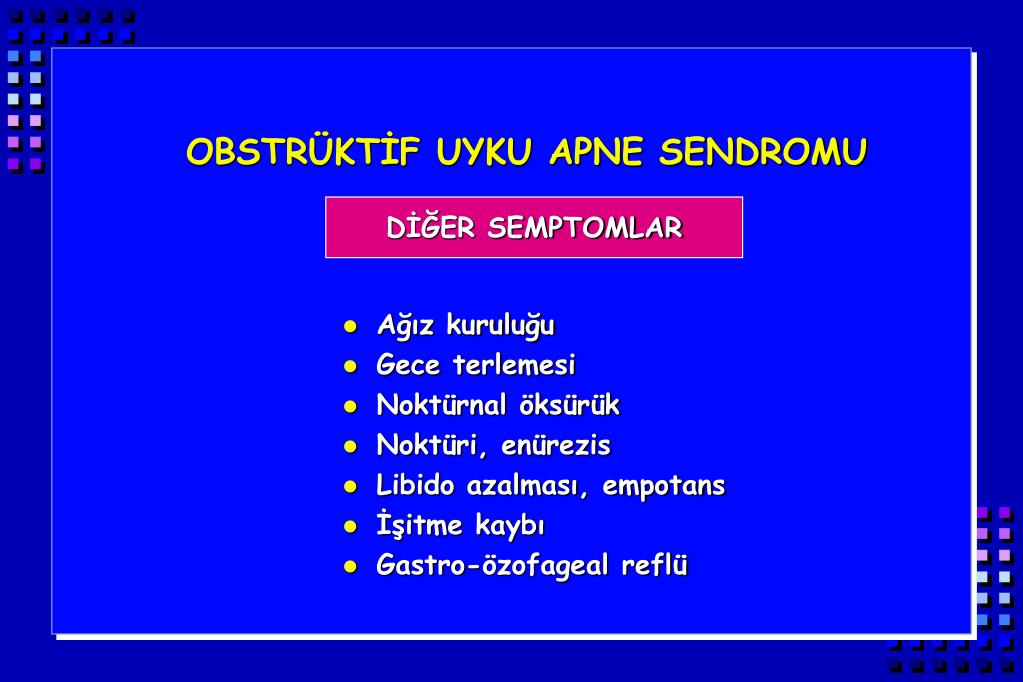 OBSTRÜKTİF UYKU APNE SENDROMU DİĞER SEMPTOMLAR • Ağız kuruluğu • Gece terlemesi • Noktürnal öksürük • Noktüri, enürezis • Libido azalması, empotans • İşitme kaybı • Gastro-özofageal reflü