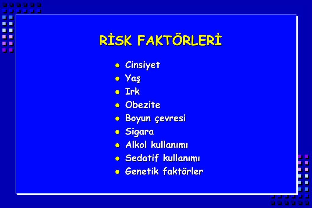 RİSK FAKTÖRLERİ Cinsiyet Yaş Irk Obezite Boyun çevresi Sigara Alkol kullanımı Sedatif kullanımı Genetik faktörler