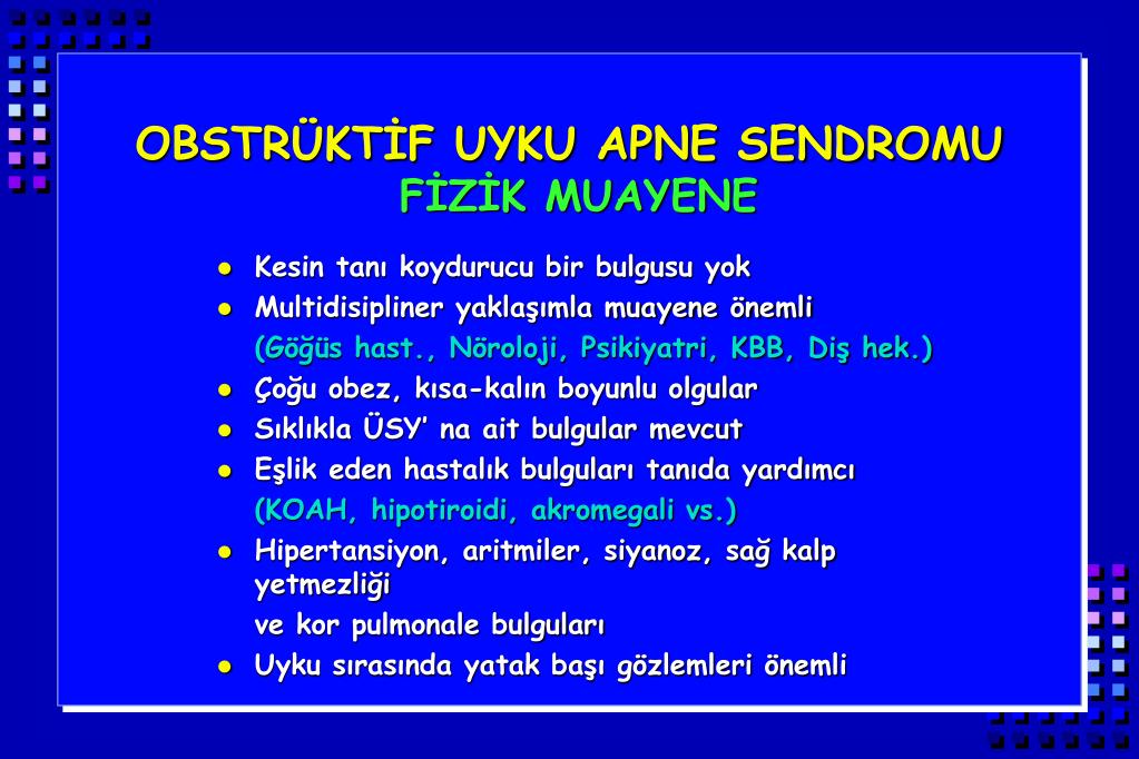 OBSTRÜKTİF UYKU APNE SENDROMU FİZİK MUAYENE • Kesin tanı koydurucu bir bulgusu yok • Multidisipliner yaklaşımla muayene önemli (Göğüs hast., Nöroloji, Psikiyatri, KBB, Diş hek.) • Çoğu obez, kısa-kalın boyunlu olgular • Sıklıkla ÜSY’ na ait bulgular mevcut • Eşlik eden hastalık bulguları tanıda yardımcı (KOAH, hipotiroidi, akromegali vs.) • Hipertansiyon, aritmiler, siyanoz, sağ kalp yetmezliği ve kor pulmonale bulguları • Uyku sırasında yatak başı gözlemleri önemli