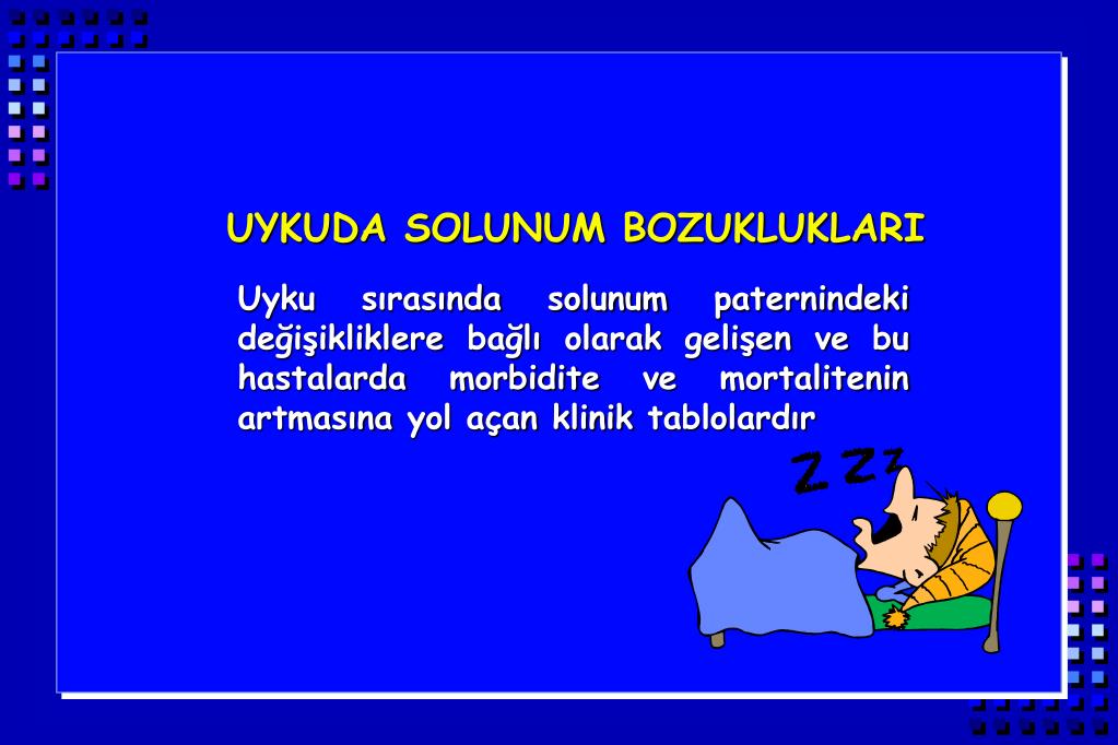 UYKUDA SOLUNUM BOZUKLUKLARI Uyku sırasında solunum paternindeki değişikliklere bağlı olarak gelişen ve bu hastalarda morbidite ve mortalitenin artmasına yol açan klinik tablolardır