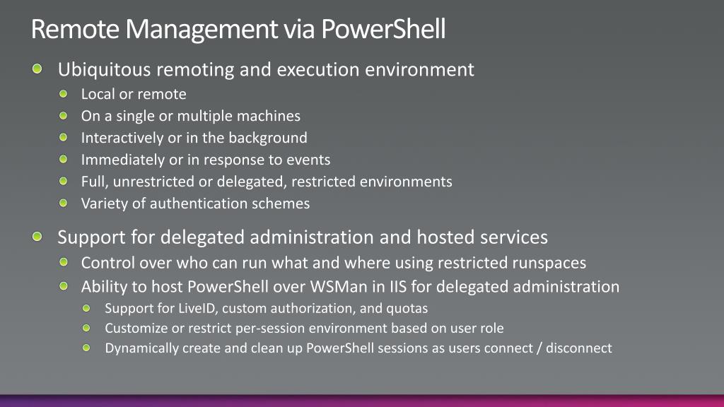 Remote Management via PowerShell • Ubiquitous remoting and execution environment • Local or remote • On a single or multiple machines • Interactively or in the background • Immediately or in response to events • Full, unrestricted or delegated, restricted environments • Variety of authentication schemes • Support for delegated administration and hosted services • Control over who can run what and where using restricted runspaces • Ability to host PowerShell over WSMan in IIS for delegated administration • Support for LiveID, custom authorization, and quotas • Customize or restrict per-session environment based on user role • Dynamically create and clean up PowerShell sessions as users connect / disconnect
