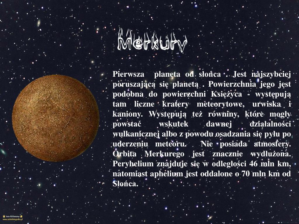 Pierwsza planeta od słońca . Jest najszybciej poruszającą się planetą . Powierzchnia jego jest podobna do powierzchni Księżyca - występują tam liczne kratery meteorytowe, urwiska i kaniony. Występują też równiny, które mogły powstać wskutek dawnej działalności wulkanicznej albo z powodu osadzania się pyłu po uderzeniu meteoru. Nie posiada atmosfery. Orbita Merkurego jest znacznie wydłużona. Peryhelium znajduje się w odległości 46 mln km, natomiast aphelium jest oddalone o 70 mln km od Słońca.