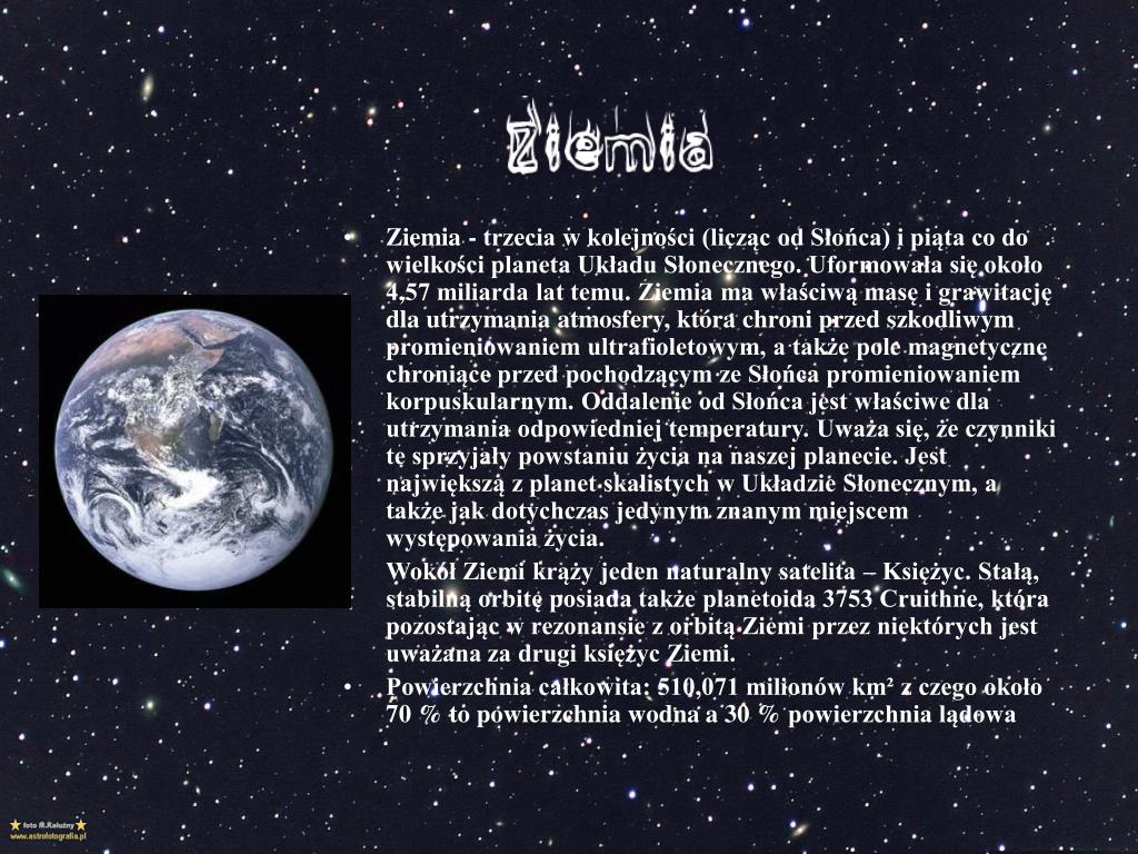 Ziemia - trzecia w kolejności (licząc od Słońca) i piąta co do wielkości planeta Układu Słonecznego. Uformowała się około 4,57 miliarda lat temu. Ziemia ma właściwą masę i grawitację dla utrzymania atmosfery, która chroni przed szkodliwym promieniowaniem ultrafioletowym, a także pole magnetyczne chroniące przed pochodzącym ze Słońca promieniowaniem korpuskularnym. Oddalenie od Słońca jest właściwe dla utrzymania odpowiedniej temperatury. Uważa się, że czynniki te sprzyjały powstaniu życia na naszej planecie. Jest największą z planet skalistych w Układzie Słonecznym, a także jak dotychczas jedynym znanym miejscem występowania życia. • Wokół Ziemi krąży jeden naturalny satelita – Księżyc. Stałą, stabilną orbitę posiada także planetoida 3753 Cruithne, która pozostając w rezonansie z orbitą Ziemi przez niektórych jest uważana za drugi księżyc Ziemi. • Powierzchnia całkowita: 510,071 milionów km² z czego około 70 % to powierzchnia wodna a 30 % powierzchnia lądowa