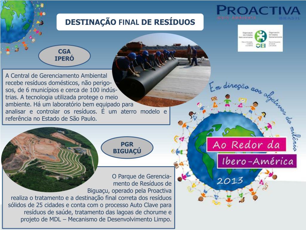 Launch of the campaign across Ibero-America in September 2013. Proactiva Environment operations in 8 Latin American countries. Waste management, landfill construction, clean development projects, recycling efforts. Details of waste management facilities in Brazil and Iberian-American States Organization (OEI).