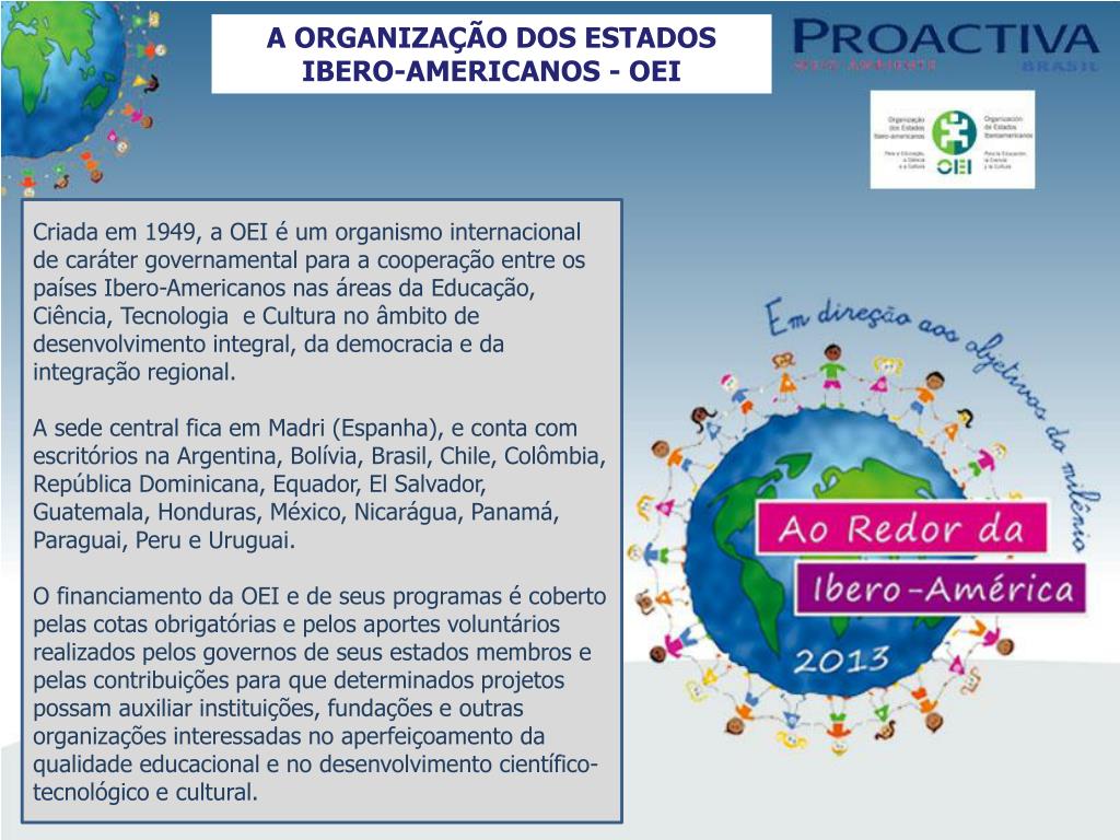A ORGANIZAÇÃO DOS ESTADOS IBERO-AMERICANOS - OEI Criada em 1949, a OEI é um organismo internacional de caráter governamental para a cooperação entre os países Ibero-Americanos nas áreas da Educação, Ciência, Tecnologia e Cultura no âmbito de desenvolvimento integral, da democracia e da integração regional. A sede central fica em Madri (Espanha), e conta com escritórios na Argentina, Bolívia, Brasil, Chile, Colômbia, República Dominicana, Equador, El Salvador, Guatemala, Honduras, México, Nicarágua, Panamá, Paraguai, Peru e Uruguai. O financiamento da OEI e de seus programas é coberto pelas cotas obrigatórias e pelos aportes voluntários realizados pelos governos de seus estados membros e pelas contribuições para que determinados projetos possam auxiliar instituições, fundações e outras organizações interessadas no aperfeiçoamento da qualidade educacional e no desenvolvimento científico-tecnológico e cultural.