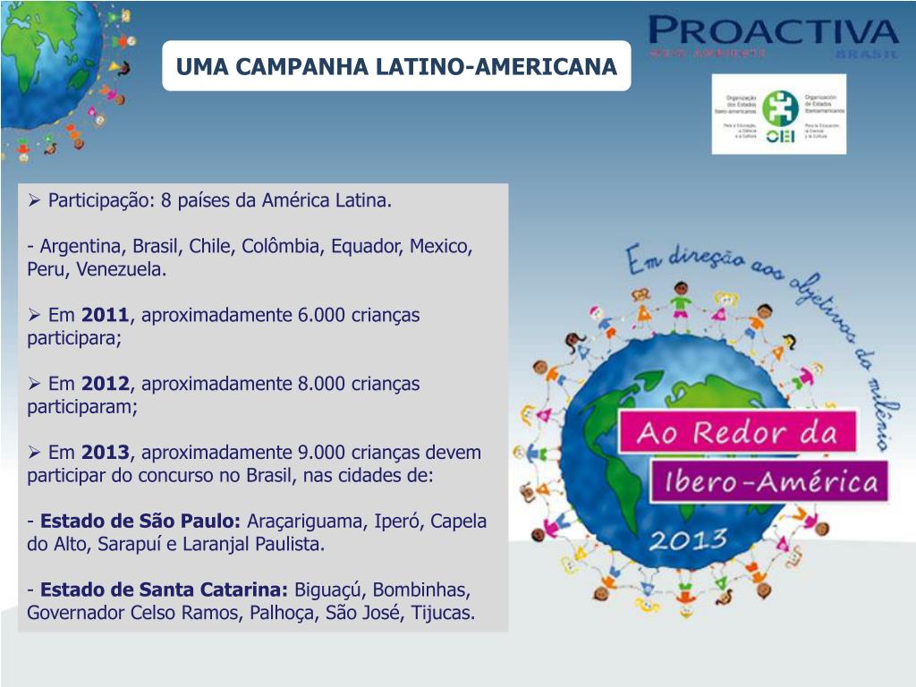 UMA CAMPANHA LATINO-AMERICANA • Participação: 8 países da América Latina. • - Argentina, Brasil, Chile, Colômbia, Equador, Mexico, Peru, Venezuela. • Em 2011, aproximadamente 6.000 crianças participara; • Em 2012, aproximadamente 8.000 crianças participaram; • Em 2013, aproximadamente 9.000 crianças devem participar do concurso no Brasil, nas cidades de: • - Estado de São Paulo: Araçariguama, Iperó, Capela do Alto, Sarapuí e Laranjal Paulista. • - Estado de Santa Catarina:Biguaçú, Bombinhas, Governador Celso Ramos, Palhoça, São José, Tijucas.
