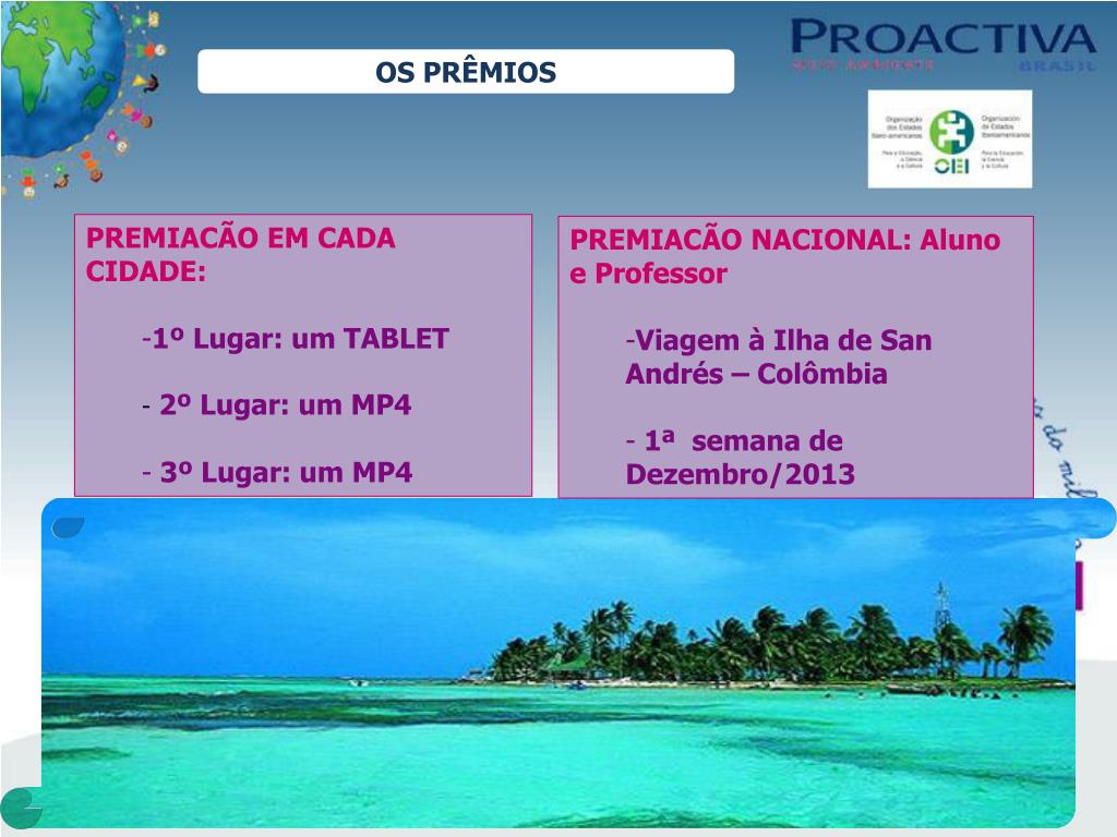 OS PRÊMIOS • PREMIACÃO EM CADA CIDADE: • 1º Lugar: um TABLET • 2º Lugar: um MP4 • 3º Lugar: um MP4 • PREMIACÃO NACIONAL: Aluno e Professor • Viagem à Ilha de San Andrés – Colômbia • 1ª semana de Dezembro/2013