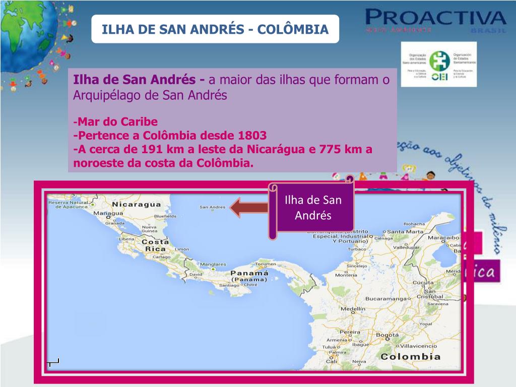 ILHA DE SAN ANDRÉS - COLÔMBIA Ilha de San Andrés - a maior das ilhas que formam o Arquipélago de SanAndrés -Mar do Caribe -Pertence a Colômbia desde 1803 -A cerca de 191 km a leste da Nicarágua e 775 km a noroeste da costa da Colômbia. Ilha de San Andrés