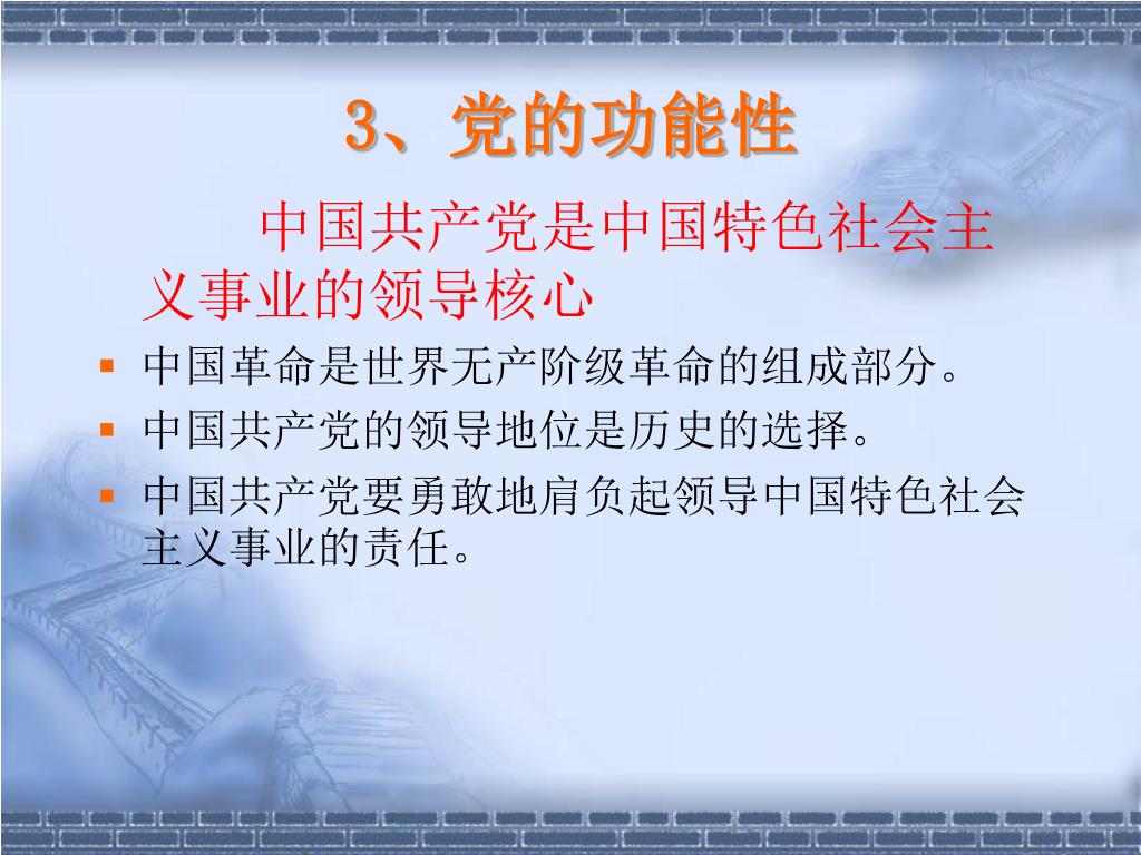 3、党的功能性 中国共产党是中国特色社会主义事业的领导核心 中国革命是世界无产阶级革命的组成部分。 中国共产党的领导地位是历史的选择。 中国共产党要勇敢地肩负起领导中国特色社会主义事业的责任。
