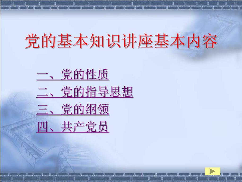 中国共产党 的基本知识. 2010 年 10 月. 党的基本知识讲座基本内容. 一、党的性质 二、党的指导思想 三、党的纲领 四、共产党员. 一、党的性质. 党章关于党的性质的规定: 中国共产党是中国工人阶级的先锋队,同时是中国人民和中华民族的先锋队,是中国特色社会主义事业的领导核心,代表中国先进生产力的发展要求,代表中国先进文化的前进方向,代表中国最广大人民的根本利益。党的最高理想和最终目标是实现共产主义。. 一、党的性质. 阶级性:工人阶级的先锋队 代表性:中国人民和中华民族的先锋队 功能性:中国特色社会主义事业的领导核心 方向性:三个代表