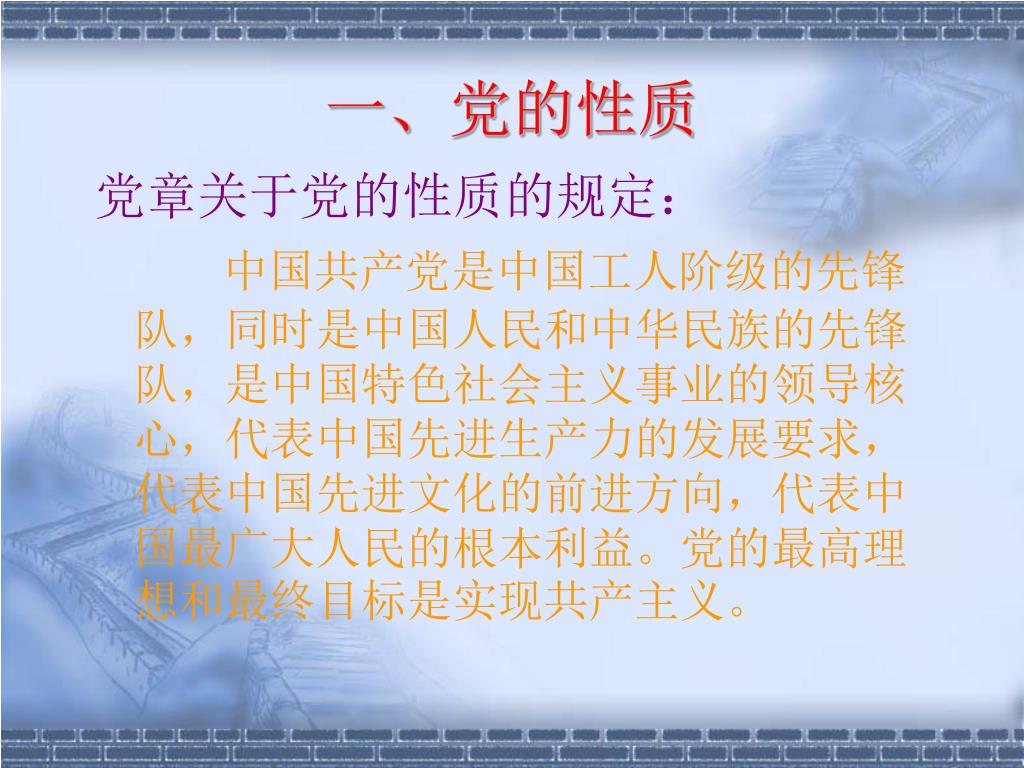 一、党的性质 党章关于党的性质的规定: 中国共产党是中国工人阶级的先锋队,同时是中国人民和中华民族的先锋队,是中国特色社会主义事业的领导核心,代表中国先进生产力的发展要求,代表中国先进文化的前进方向,代表中国最广大人民的根本利益。党的最高理想和最终目标是实现共产主义。