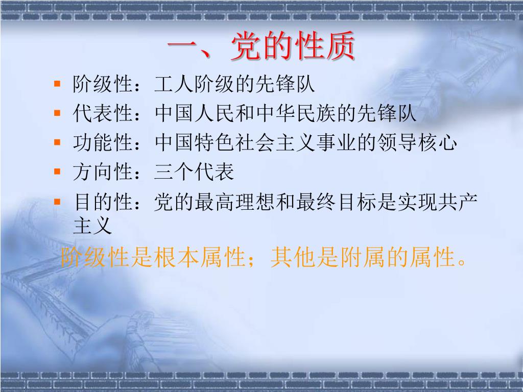 一、党的性质 阶级性:工人阶级的先锋队 代表性:中国人民和中华民族的先锋队 功能性:中国特色社会主义事业的领导核心 方向性:三个代表 目的性:党的最高理想和最终目标是实现共产主义 阶级性是根本属性;其他是附属的属性。