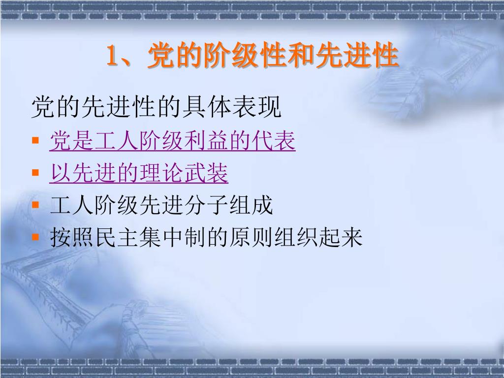 1、党的阶级性和先进性 党的先进性的具体表现 党是工人阶级利益的代表 以先进的理论武装 工人阶级先进分子组成 按照民主集中制的原则组织起来