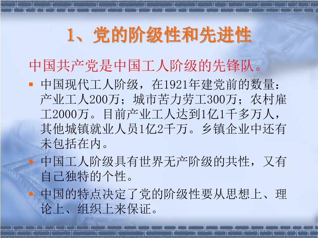1、党的阶级性和先进性 中国共产党是中国工人阶级的先锋队。 中国现代工人阶级,在1921年建党前的数量:产业工人200万;城市苦力劳工300万;农村雇工2000万。目前产业工人达到1亿1千多万人,其他城镇就业人员1亿2千万。乡镇企业中还有未包括在内。 中国工人阶级具有世界无产阶级的共性,又有自己独特的个性。 中国的特点决定了党的阶级性要从思想上、理论上、组织上来保证。