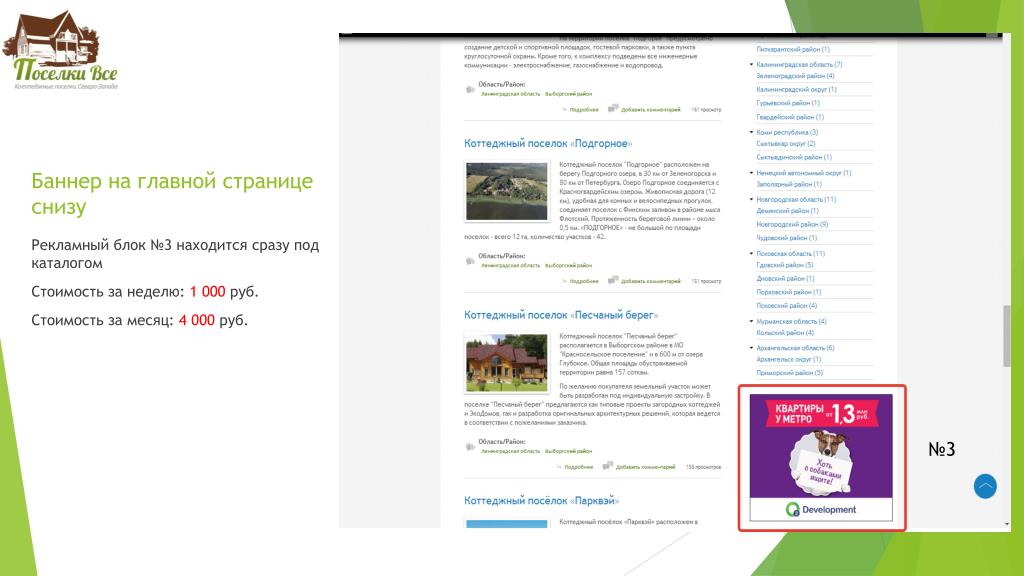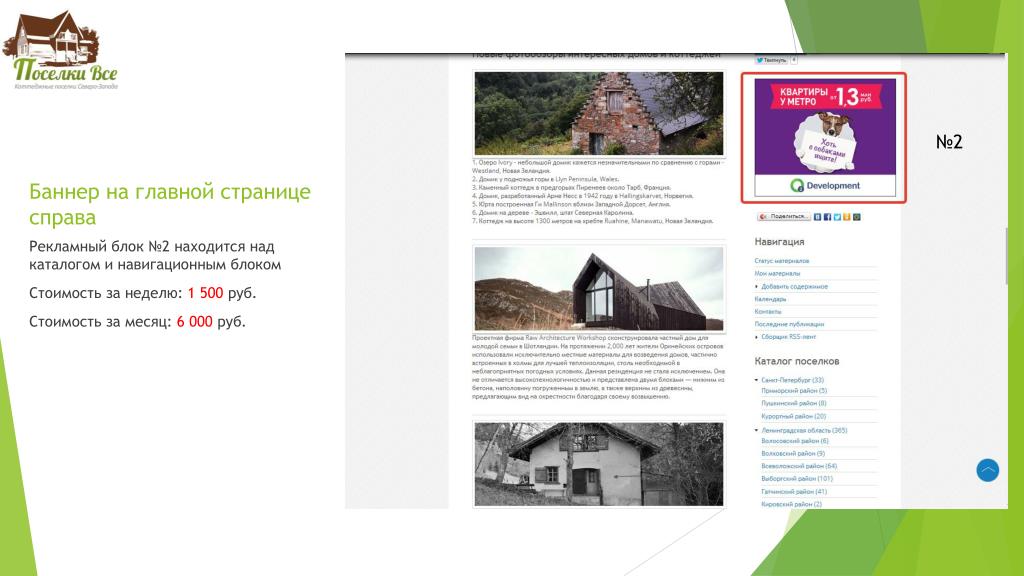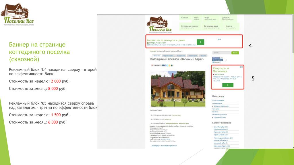 Баннер на странице коттеджного поселка (сквозной) 4 Рекламный блок №4 находится сверху – второй по эффективности блок Стоимость за неделю: 2 000 руб. Стоимость за месяц: 8 000 руб. Рекламный блок №5 находится сверху справа над каталогом – третий по эффективности блок Стоимость за неделю: 1 500 руб. Стоимость за месяц: 6 000 руб. 5