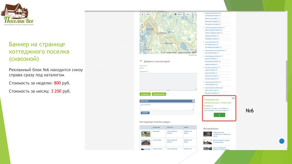 Баннер на странице коттеджного поселка (сквозной) Рекламный блок №6 находится снизу справа сразу под каталогом Стоимость за неделю: 800 руб. Стоимость за месяц: 3 200 руб. №6