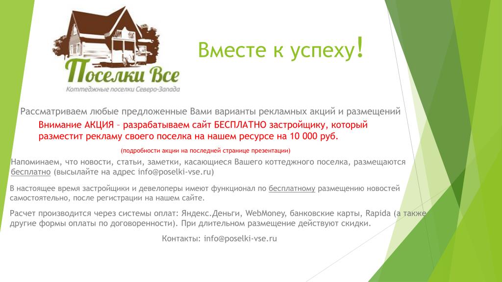 Вместе к успеху! Внимание АКЦИЯ – разрабатываем сайт БЕСПЛАТНО застройщику, который разместит рекламу своего поселка на нашем ресурсе на 10 000 руб. (подробности акции на последней странице презентации) Напоминаем, что новости, статьи, заметки, касающиеся Вашего коттеджного поселка, размещаются бесплатно (высылайте на адрес info@poselki-vse.ru) Рассматриваем любые предложенные Вами варианты рекламных акций и размещений В настоящее время застройщики и девелоперы имеют функционал по бесплатному размещению новостей самостоятельно, после регистрации на нашем сайте. Расчет производится через системы оплат: Яндекс.Деньги, WebMoney, банковские карты, Rapida (а также другие формы оплаты по договоренности). При длительном размещение действуют скидки. Контакты: info@poselki-vse.ru