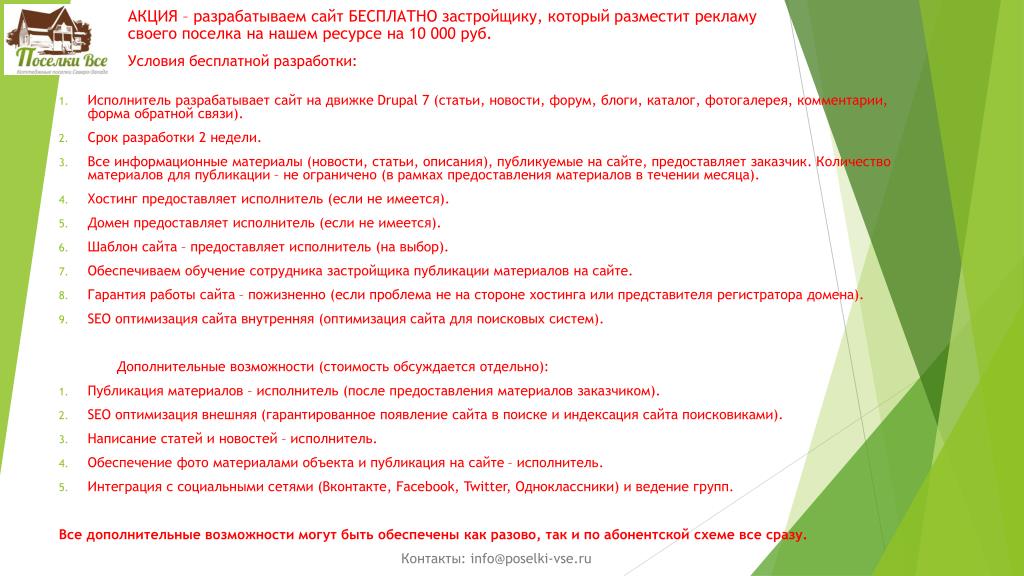 АКЦИЯ – разрабатываем сайт БЕСПЛАТНО застройщику, который разместит рекламу своего поселка на нашем ресурсе на 10 000 руб. Условия бесплатной разработки: Исполнитель разрабатывает сайт на движке Drupal 7 (статьи, новости, форум, блоги, каталог, фотогалерея, комментарии, форма обратной связи). Срок разработки 2 недели. Все информационные материалы (новости, статьи, описания), публикуемые на сайте, предоставляет заказчик. Количество материалов для публикации – не ограничено (в рамках предоставления материалов в течении месяца). Хостинг предоставляет исполнитель (если не имеется). Домен предоставляет исполнитель (если не имеется). Шаблон сайта – предоставляет исполнитель (на выбор). Обеспечиваем обучение сотрудника застройщика публикации материалов на сайте. Гарантия работы сайта – пожизненно (если проблема не на стороне хостинга или представителя регистратора домена). SEO оптимизация сайта внутренняя (оптимизация сайта для поисковых систем). Дополнительные возможности(стоимость обсуждается отдельно): Публикация материалов – исполнитель (после предоставления материалов заказчиком). SEO оптимизация внешняя (гарантированное появление сайта в поиске и индексация сайта поисковиками). Написание статей и новостей – исполнитель. Обеспечение фото материалами объекта и публикация на сайте – исполнитель. Интеграция с социальными сетями (Вконтакте, Facebook, Twitter, Одноклассники) и ведение групп. Все дополнительные возможности могут быть обеспечены как разово, так и по абонентской схеме все сразу. Контакты: info@poselki-vse.ru