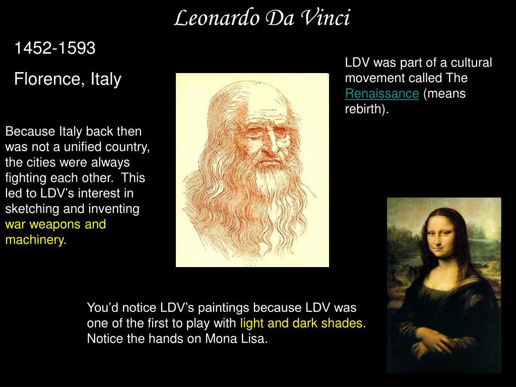 Leonardo Da Vinci 1452-1593 Florence, Italy LDV was part of a cultural movement called The Renaissance (means rebirth). Because Italy back then was not a unified country, the cities were always fighting each other. This led to LDV’s interest in sketching and inventing war weapons and machinery. You’d notice LDV’s paintings because LDV was one of the first to play with light and dark shades. Notice the hands on Mona Lisa.