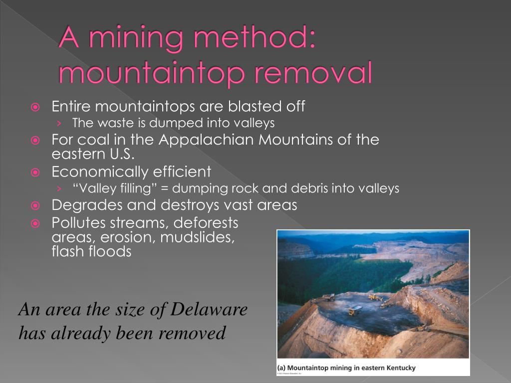 A mining method: mountaintop removal • Entire mountaintops are blasted off • The waste is dumped into valleys • For coal in the Appalachian Mountains of the eastern U.S. • Economically efficient • “Valley filling” = dumping rock and debris into valleys • Degrades and destroys vast areas • Pollutes streams, deforests areas, erosion, mudslides, flash floods An area the size of Delaware has already been removed
