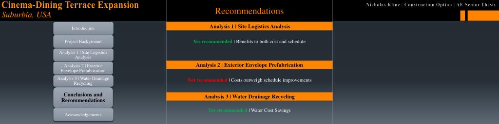 Recommendations Analysis 1 | Site Logistics Analysis Yes recommended | Benefits to both cost and schedule Analysis 2 | Exterior Envelope Prefabrication Not recommended | Costs outweigh schedule improvements Analysis 3 | Water Drainage Recycling Yes recommended | Water Cost Savings