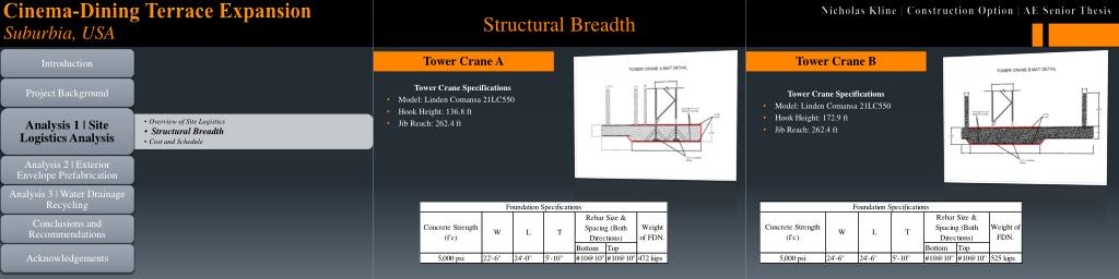 Structural Breadth Tower Crane Specifications Model: Linden Comansa 21LC550 Hook Height: 136.8 ft Jib Reach: 262.4 ft Tower Crane Specifications Model: Linden Comansa 21LC550 Hook Height: 172.9 ft Jib Reach: 262.4 ft Tower Crane A Tower Crane B