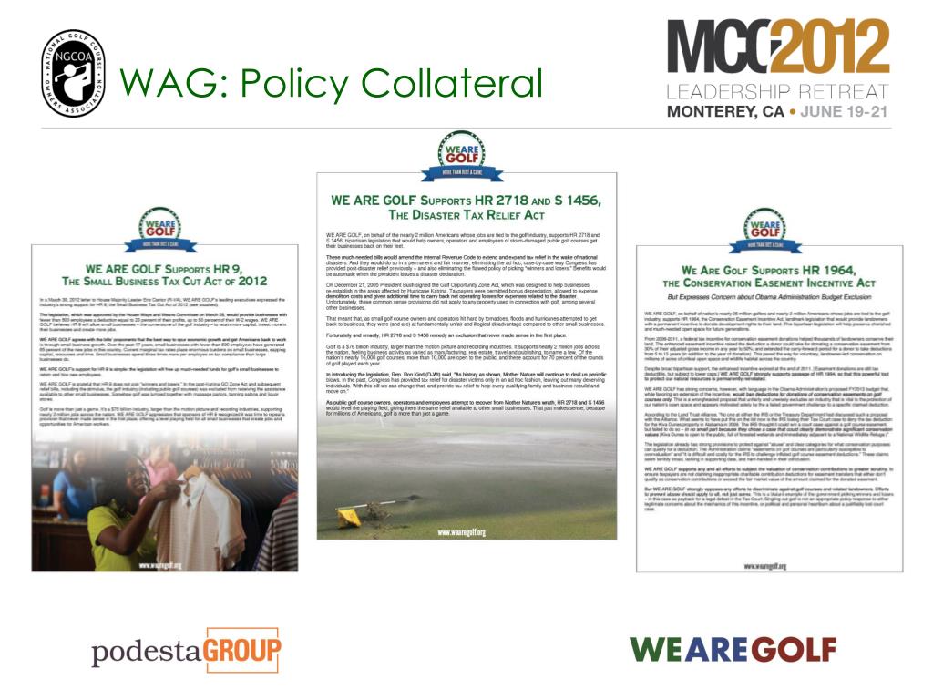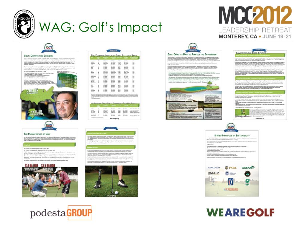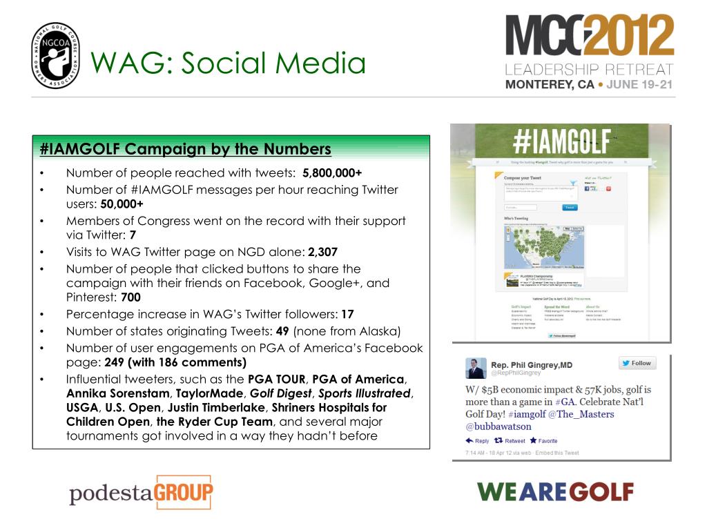 WAG: Traditional Media • Media Placements by the Numbers • Estimated number of impressions: 188,216,000 • Total media direct distribution: 10,000 • Estimated number of online links: 75 • Percentage of online publicity placements: 74% • Editorial placements:58 • Steve Mona radio interviews: 8 • Large metric, national publicity hits were obtained in media outlets such as the New York Times, USA Today, The Washington Post, Yahoo!, Arizona Republic, The Golf Channel, NBC, Golf Digestand Golfweek, to name a few. In Congress, a Mulligan for golf By Rep. Renee Ellmers (R-NC) – April 18, 2012 “When you look beyond the dated stereotypes of the game, you will find a vibrant industry where millions of Americans spend their weekends honing in a skill and love of a game that can benefit them throughout their life.”