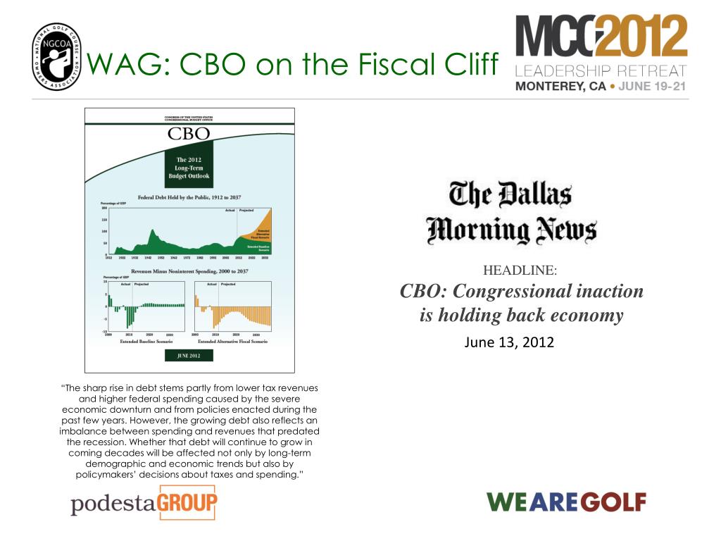 WAG: CBO on the Fiscal Cliff HEADLINE: CBO: Congressional inaction is holding back economy June 13, 2012 “The sharp rise in debt stems partly from lower tax revenues and higher federal spending caused by the severe economic downturn and from policies enacted during the past few years. However, the growing debt also reflects an imbalance between spending and revenues that predated the recession. Whether that debt will continue to grow in coming decades will be affected not only by long-term demographic and economic trends but also by policymakers’ decisions about taxes and spending.”