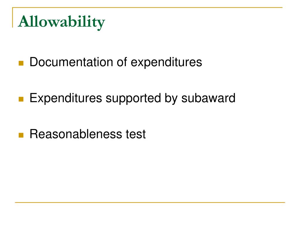 Allowability • Documentation of expenditures • Expenditures supported by subaward • Reasonableness test