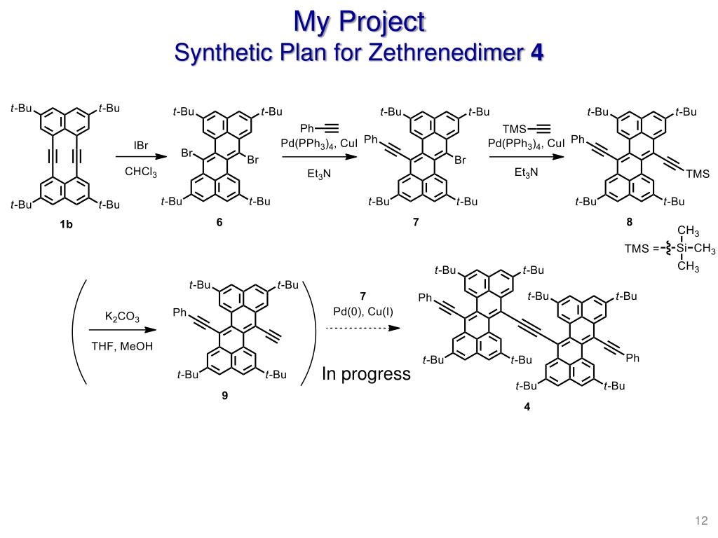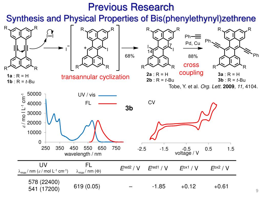 Previous ResearchSynthesis and Physical Properties of Bis(phenylethynyl)zethrene e / mo l L-1 cm-1 cross coupling transannularcyclization Tobe, Y. et al. Org. Lett.2009,11, 4104. UV / vis CV FL wavelength / nm 3b voltage / V 578 (22400)541 (17200) 619 (0.05) – -1.85 +0.12 +0.61 UV lmax/ nm (e / mol L-1 cm-1) FL lmax/ nm (F) Ered2 / V Ered1 / V Eox1 / V Eox2 / V