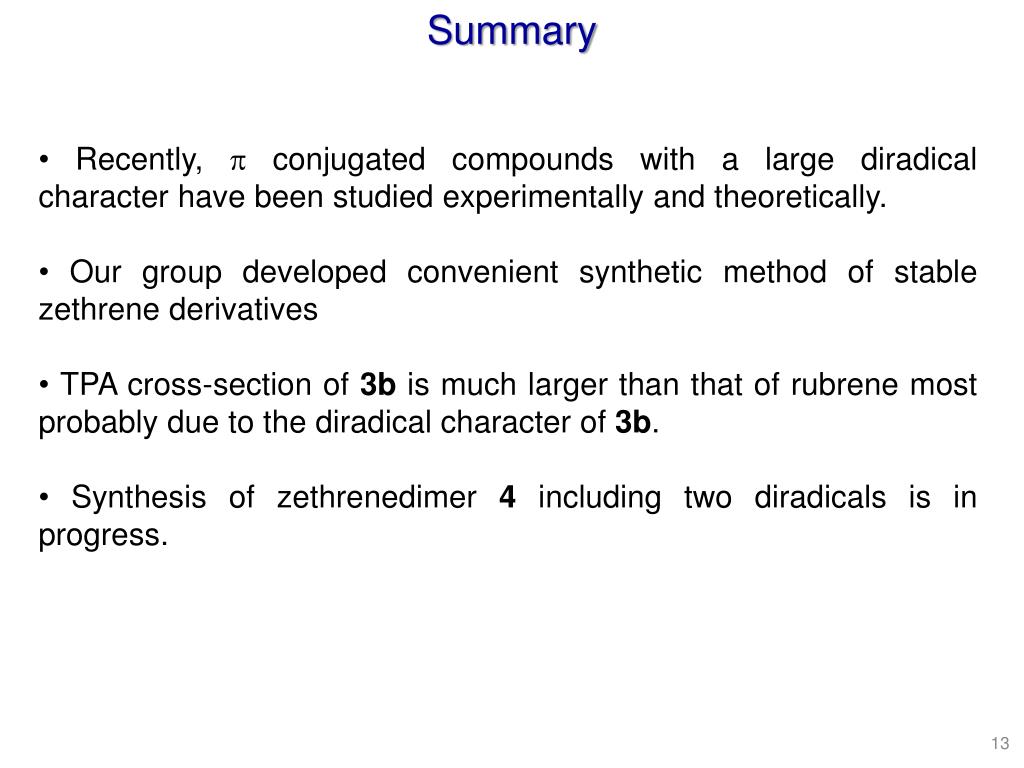 Summary • Recently, p conjugated compounds with a large diradical character have been studied experimentally and theoretically. •Our group developed convenient synthetic method of stable zethrene derivatives • TPA cross-section of 3b is much larger than that of rubrene most probably due to the diradical character of 3b. • Synthesis of zethrenedimer4 including two diradicals is in progress.