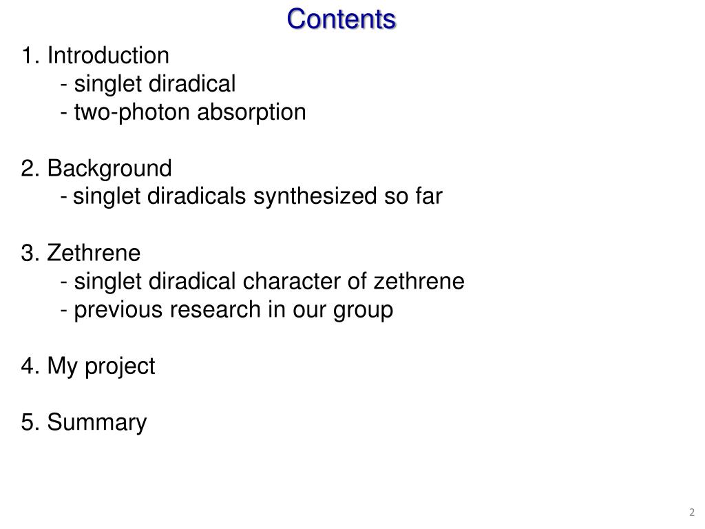 Contents 1. Introduction - singlet diradical - two-photon absorption 2. Background -singlet diradicals synthesized so far 3. Zethrene - singlet diradical character of zethrene - previous research in our group 4. My project 5. Summary