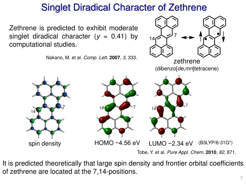 Singlet Diradical Character of Zethrene Zethreneis predicted to exhibit moderate singlet diradical character (y = 0.41)by computational studies. Nakano, M. et al. Comp. Lett.2007, 3, 333. zethrene (dibenzo[de,mn]tetracene) 7 14 7 7 14 14 HOMO −4.56 eV spin density LUMO −2.34 eV (B3LYP/6-31G*) Tobe, Y. et al. Pure Appl. Chem.2010, 82, 871. It is predicted theoretically that large spin density and frontier orbital coefficients of zethreneare located at the 7,14-positions.