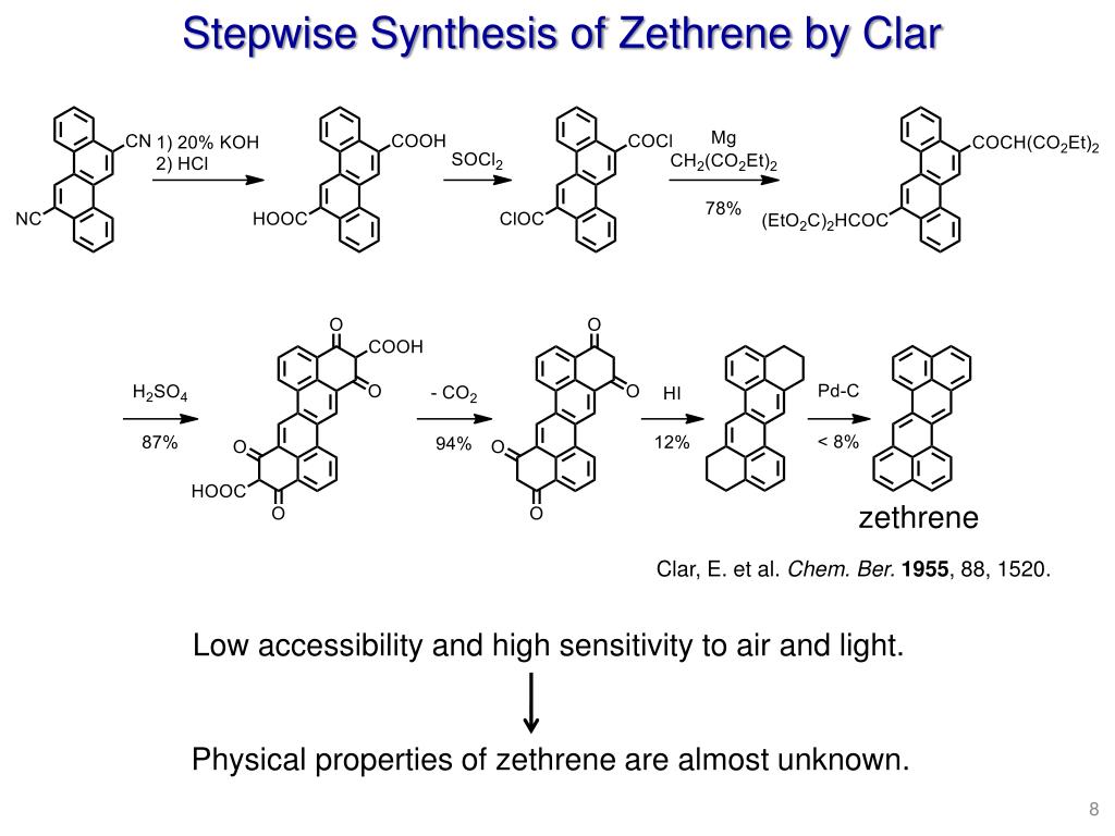 Stepwise Synthesis of Zethrene by Clar zethrene Clar, E. et al. Chem. Ber. 1955, 88, 1520. Low accessibility and high sensitivity to air and light. Physical properties of zethrene are almost unknown.