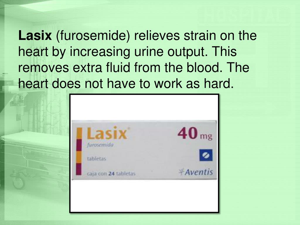 Lasix(furosemide) relieves strain on the heart by increasing urine output. This removes extra fluid from the blood. The heart does not have to work as hard.