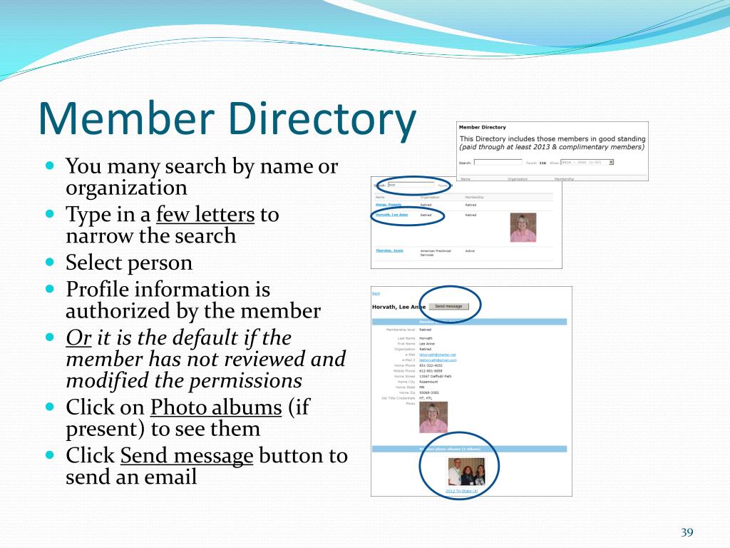 Member Directory • You many search by name or organization • Type in a few letters to narrow the search • Select person • Profile information is authorized by the member • Or it is the default if the member has not reviewed and modified the permissions • Click on Photo albums (if present) to see them • Click Send message button to send an email