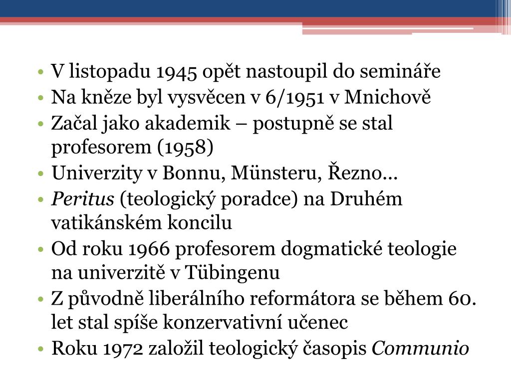 V listopadu 1945 opět nastoupil do semináře • Na kněze byl vysvěcen v 6/1951 v Mnichově • Začal jako akademik – postupně se stal profesorem (1958) • Univerzity v Bonnu, Münsteru, Řezno... • Peritus (teologický poradce) na Druhém vatikánském koncilu • Od roku 1966 profesorem dogmatické teologie na univerzitě v Tübingenu • Z původně liberálního reformátora se během 60. let stal spíše konzervativní učenec • Roku 1972 založil teologický časopis Communio