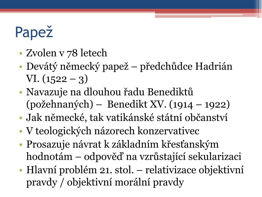 Papež • Zvolen v 78 letech • Devátý německý papež – předchůdce Hadrián VI. (1522 – 3) • Navazuje na dlouhou řadu Benediktů (požehnaných) – Benedikt XV. (1914 – 1922) • Jak německé, tak vatikánské státní občanství • V teologických názorech konzervativec • Prosazuje návrat k základním křesťanským hodnotám – odpověď na vzrůstající sekularizaci • Hlavní problém 21. stol. – relativizace objektivní pravdy / objektivní morální pravdy
