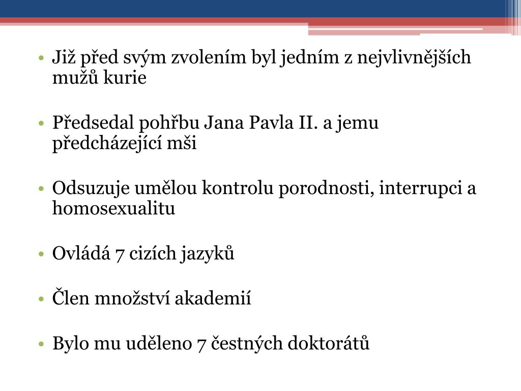 Již před svým zvolením byl jedním z nejvlivnějších mužů kurie • Předsedal pohřbu Jana Pavla II. a jemu předcházející mši • Odsuzuje umělou kontrolu porodnosti, interrupci a homosexualitu • Ovládá 7 cizích jazyků • Člen množství akademií • Bylo mu uděleno 7 čestných doktorátů
