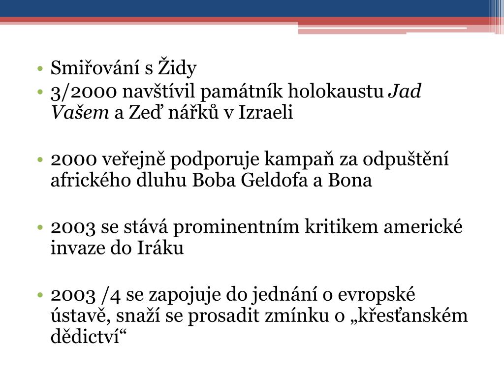 Smiřování s Židy • 3/2000 navštívil památník holokaustu Jad Vašem a Zeď nářků v Izraeli • 2000 veřejně podporuje kampaň za odpuštění afrického dluhu Boba Geldofa a Bona • 2003 se stává prominentním kritikem americké invaze do Iráku • 2003 /4 se zapojuje do jednání o evropské ústavě, snaží se prosadit zmínku o „křesťanském dědictví“